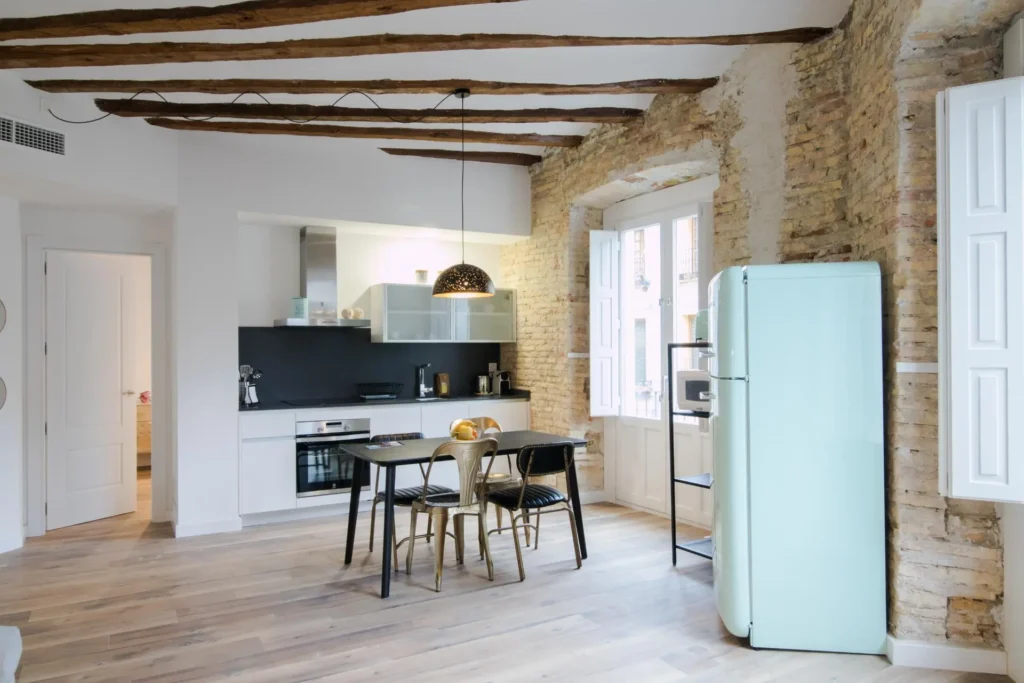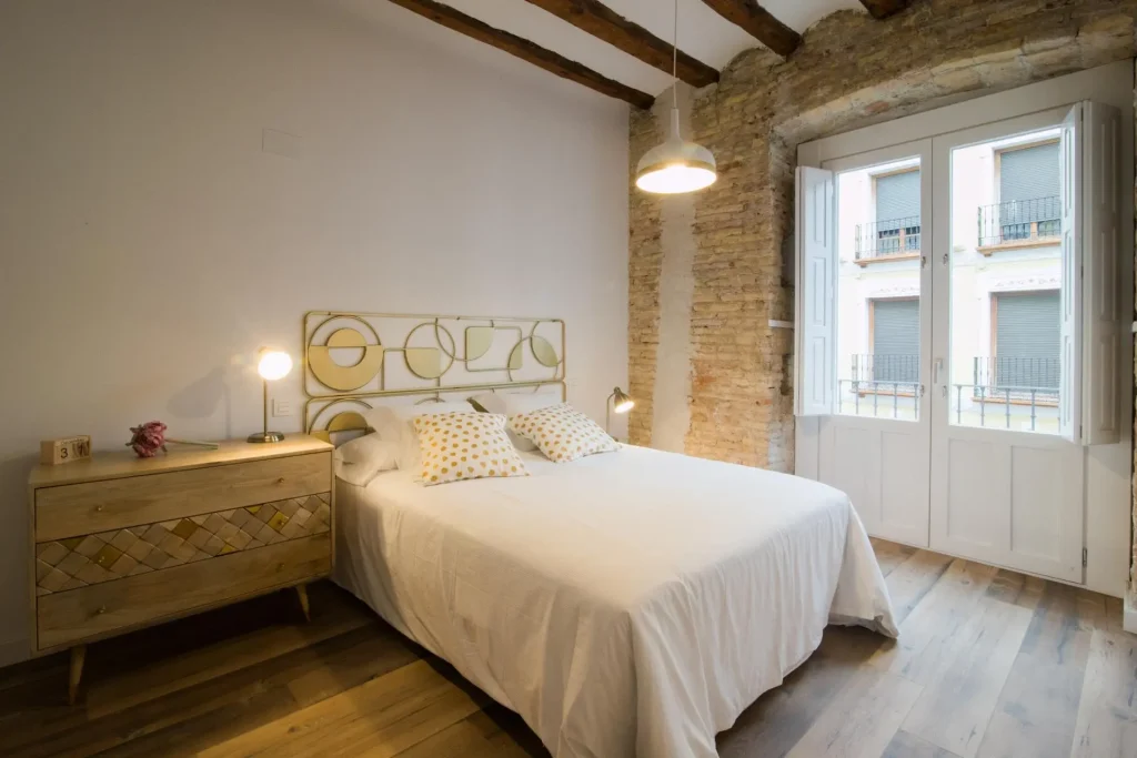 Este cómodo y elegante apartamento decorado en estilo exo-chic (se han conservado las vigas de madera y paredes de ladrillo originales) está situado en la primera planta de nuestro edificio. Ofrece 55 m2 distribuidos en un dormitorio independiente con cama doble y balcón a la calle Alfonso , salón con dos balcones a la calle Alfonso, sofá cama, comedor, cocina americana y baño con ducha.