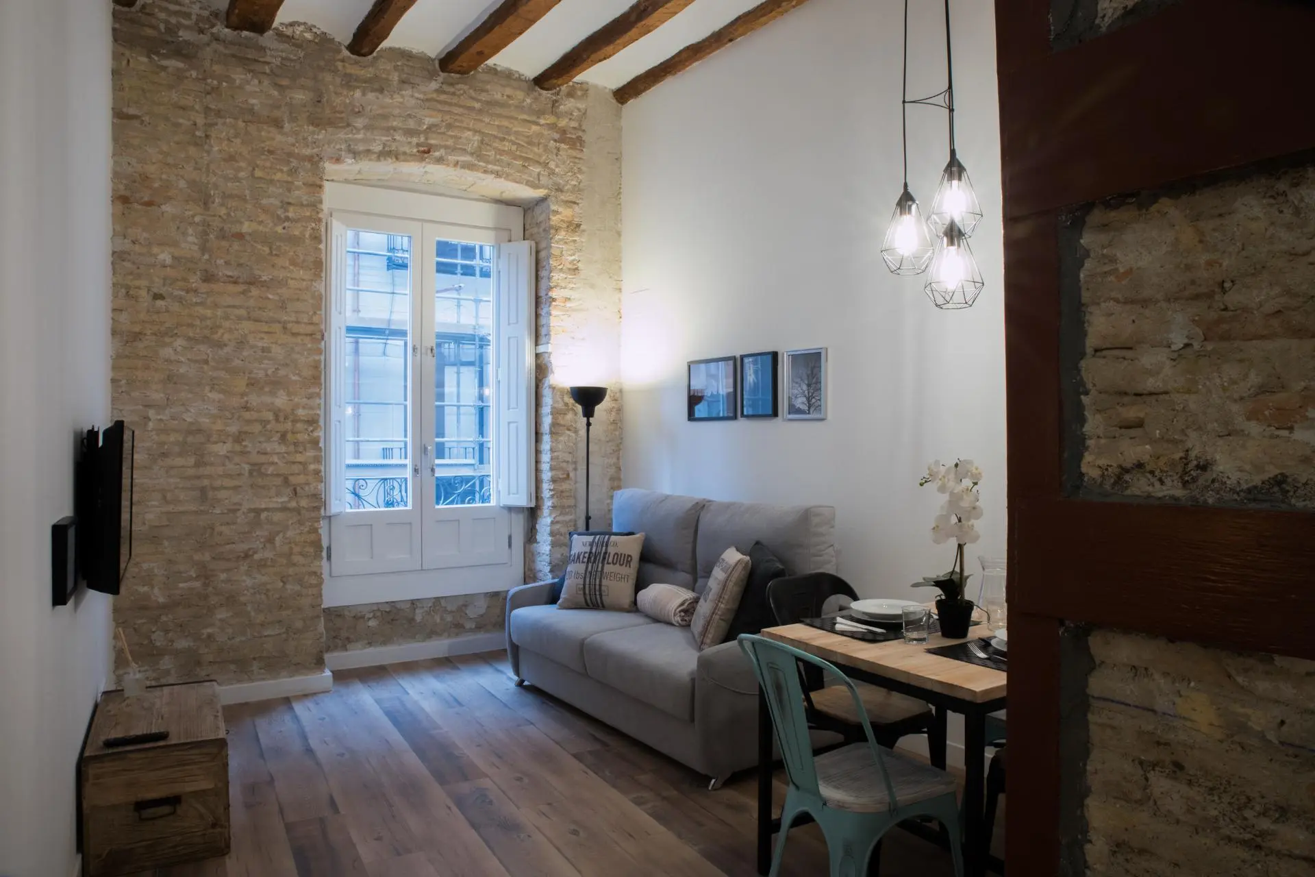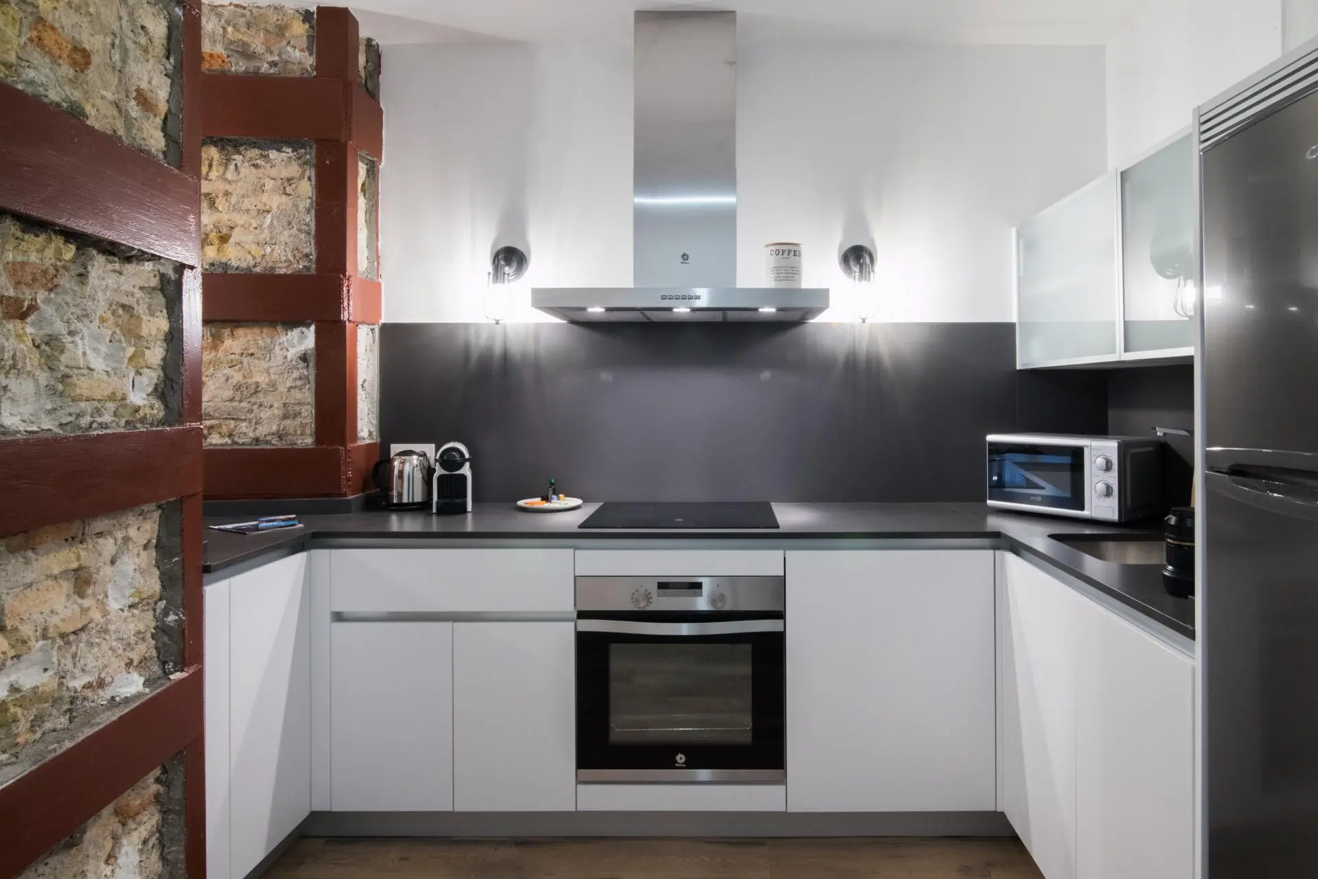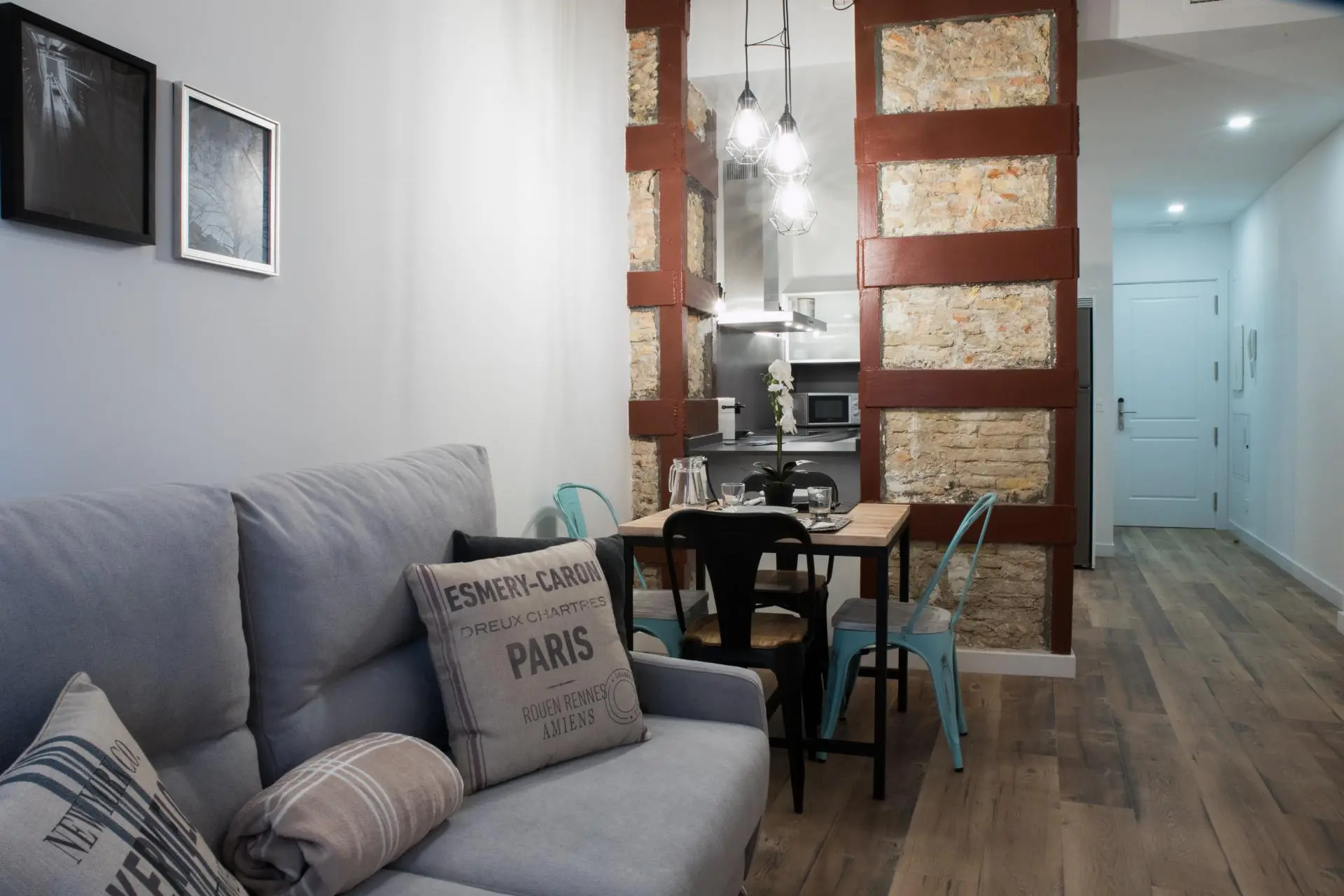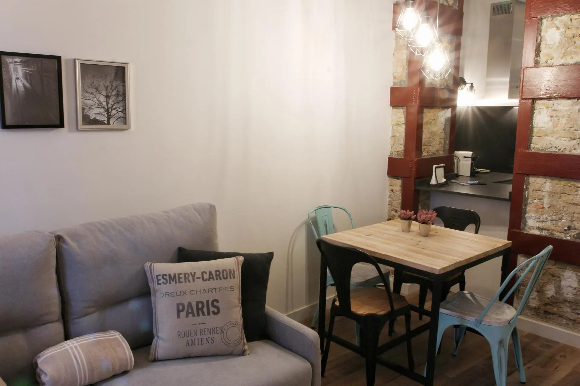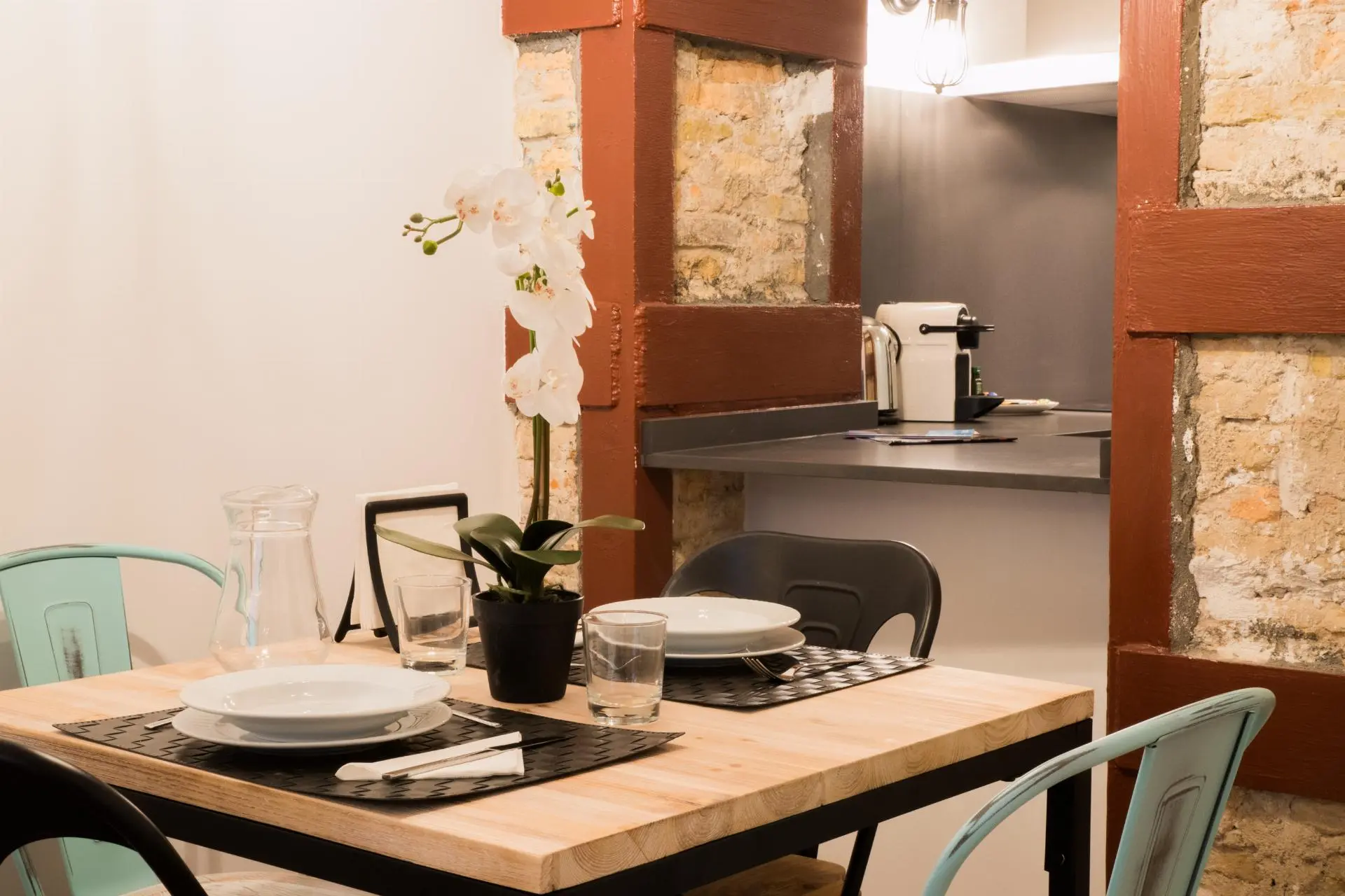 Este cómodo y elegante apartamento decorado en estilo industrial (se han conservado las vigas de madera y paredes de ladrillo originales) está situado en la planta principal de nuestro edificio. Ofrece 45 m2 distribuidos en un dormitorio independiente con cama doble con balcón , salón con sofá cama, comedor, cocina americana y baño con ducha.